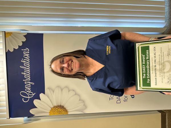 Last week, Deborah Small, B.S.N, R.N., CRNI, VA-BC, OCN, was presented a DAISY Award by Christine Williams, Chief Nursing Executive. Nominated by a patient’s family member, Deborah was recognized for the compassion, attentiveness, and initiative she displayed while providing care and which she brings to every interaction. Her thoughtful approach and willingness to go the extra mile reflect the dedication and professionalism that define nursing excellence and patient-centered care at UC Davis Health.