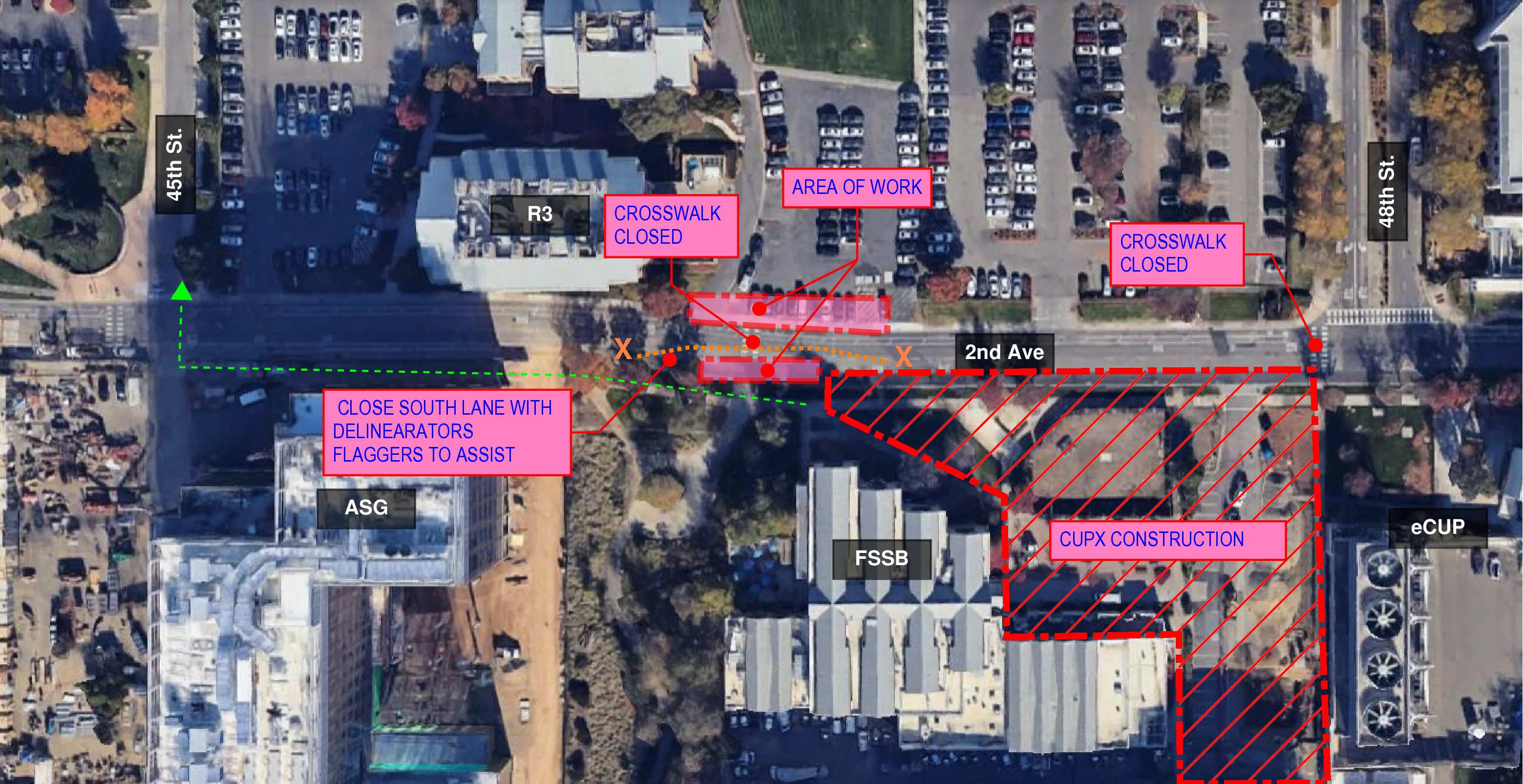 Thursday, Feb. 26, from 7 a.m. to 4 p.m., the Central Utility Plant expansion (CUPx) team will install the necessary equipment to energize the signal pole at the new Aggie Square Garage (ASG) drive and 2nd Avenue intersection, resulting in a mid-block closure of the south eastbound lane as well as the mid-block crosswalk.
