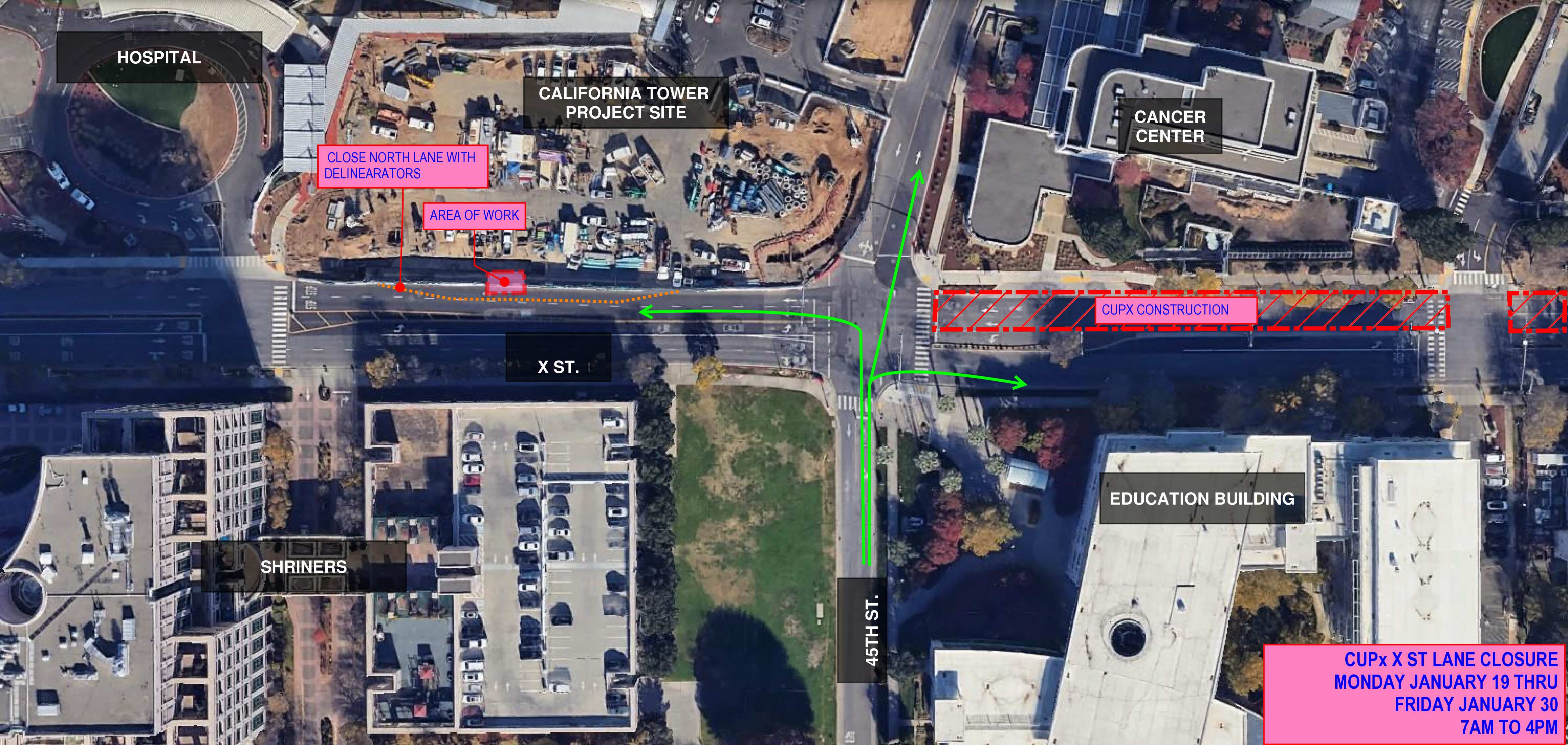 Monday, Jan. 19, through Friday, Jan. 30, from 7 a.m. to 4 p.m., the CUPx team will perform an underground utility tie-in at the California Tower project site, resulting in the closure of the adjacent northernmost westbound lane at X Street.